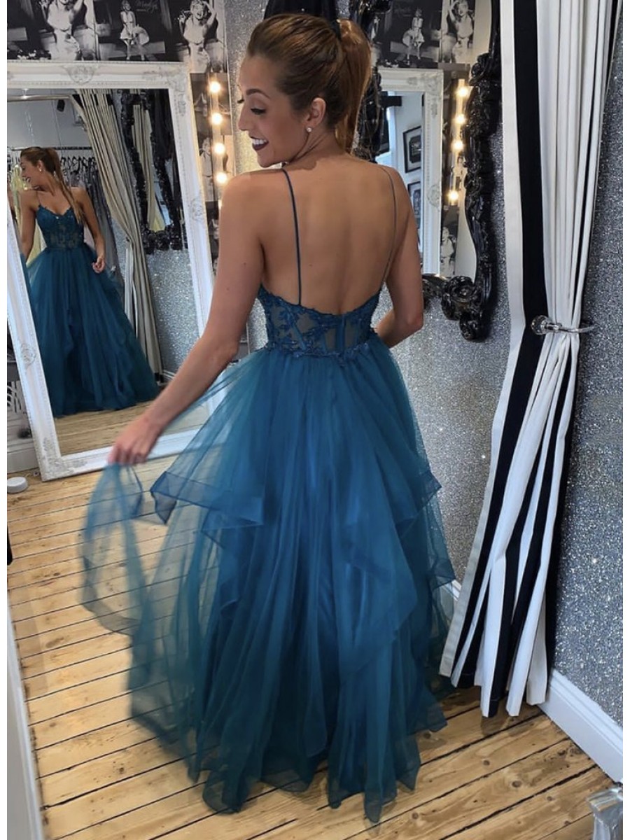 • A-Line Long Blue Spaghetti Straps Prom Dress Formal Evening Gowns 901140