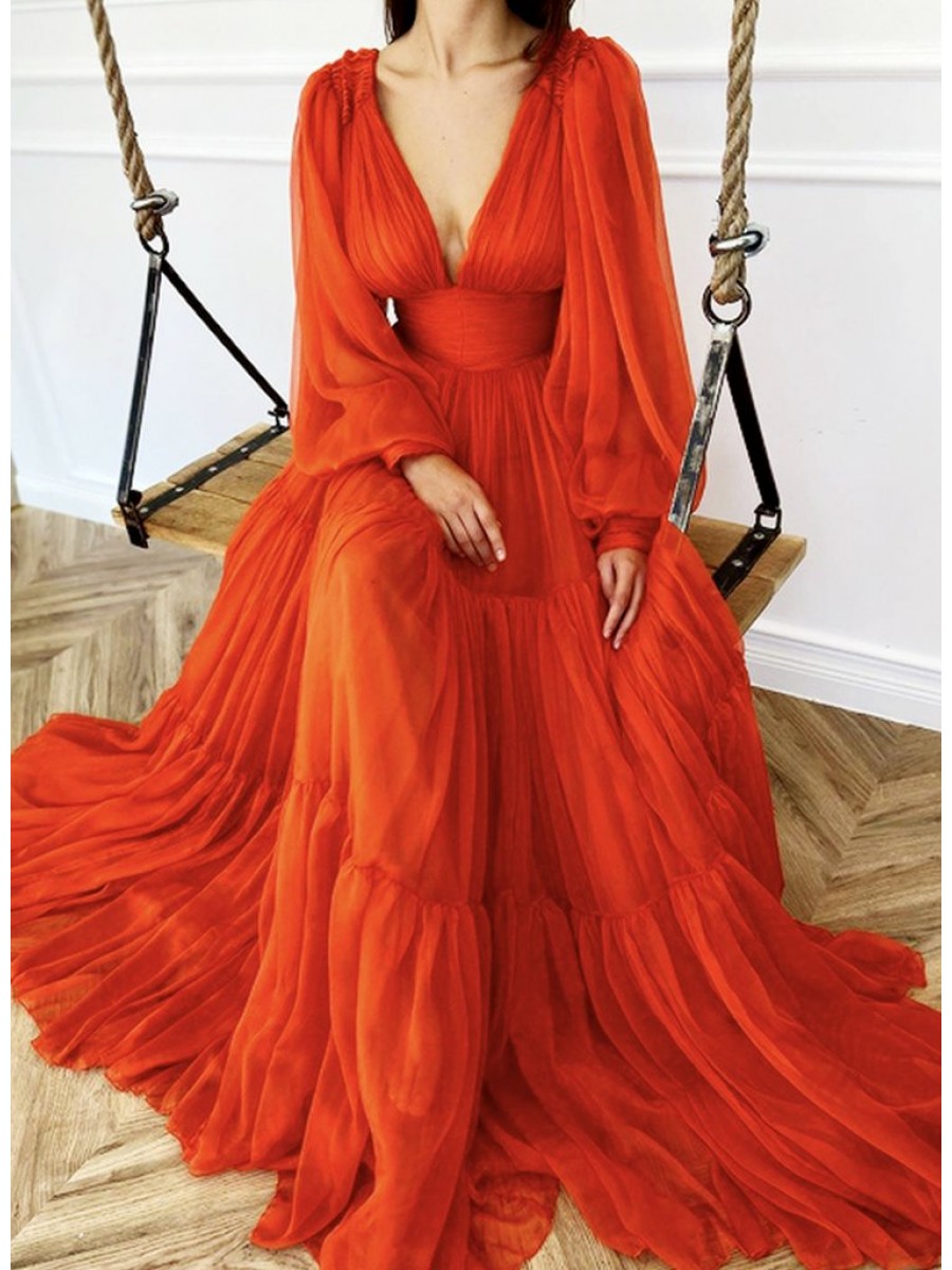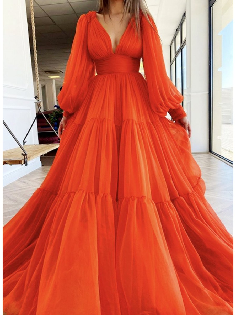 • A-Line Long Sleeves V Neck Long Prom Dresses Formal Evening Gowns 901122