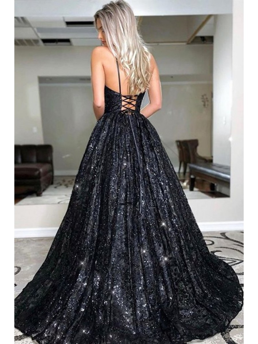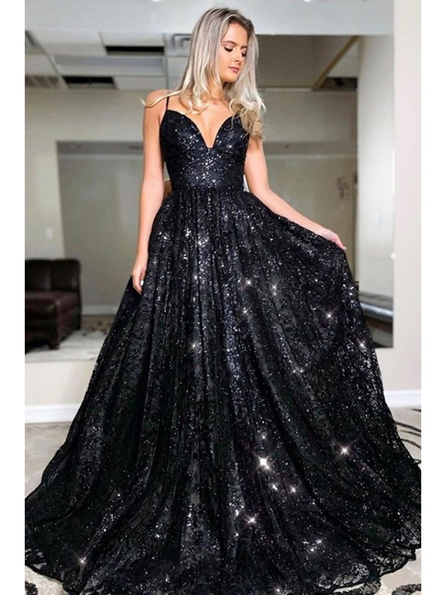• Long Black Lace Spaghetti Straps Prom Dress Formal Evening Gowns 901199