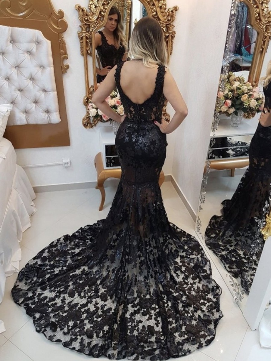 • Long Black Mermaid Lace Prom Dress Formal Evening Gowns 901282