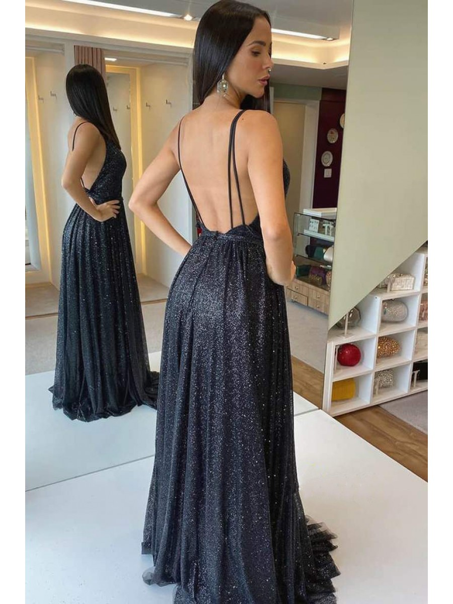 • Long Black Sequin Tulle Prom Dress Formal Evening Gowns 901239
