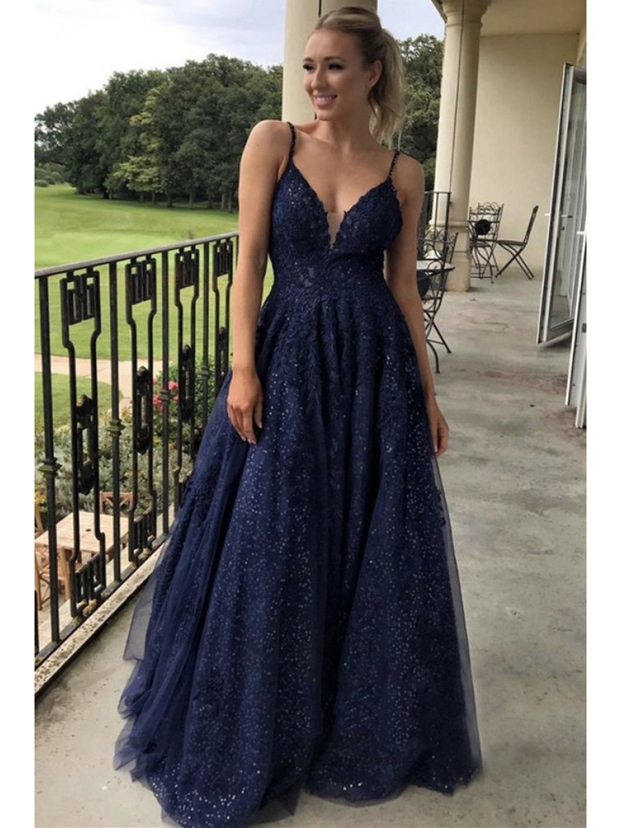 Sale Long Navy Blue Lace Sequin Tulle Prom Dress Formal Evening Gowns 901288 zoom