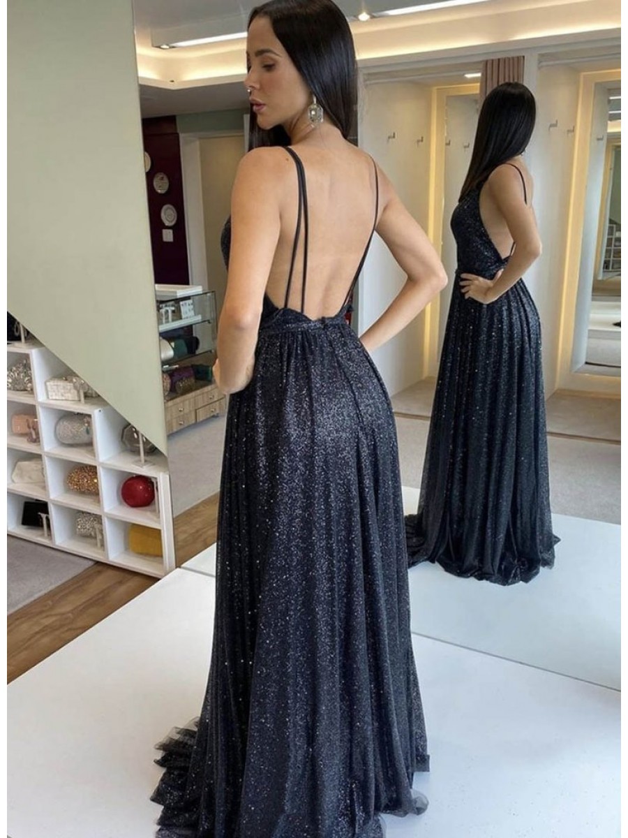 • Long Navy Blue Sequin Tulle Prom Dress Formal Evening Gowns 901316