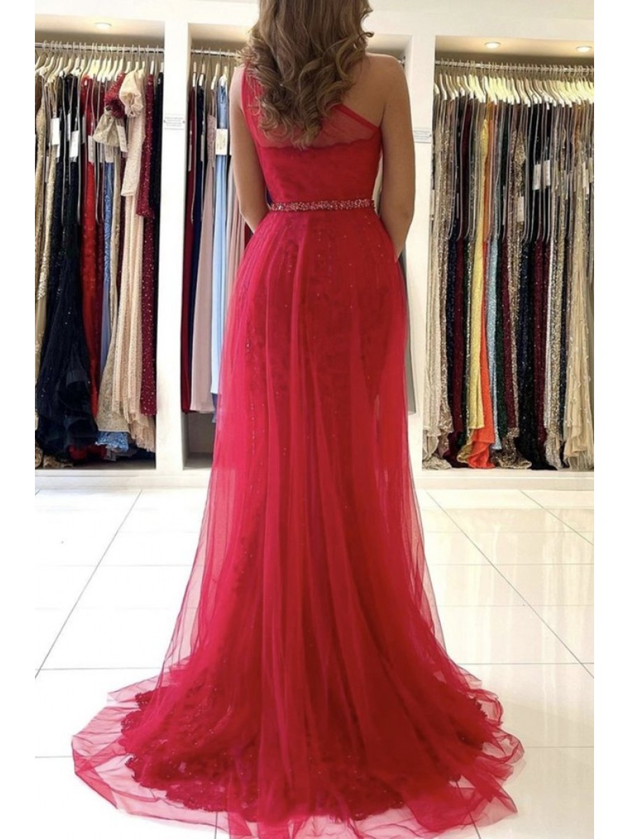 • Long Red One Shoulder Lace and Tulle Prom Dress Formal Evening Gowns 901206